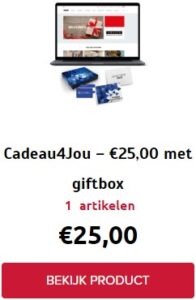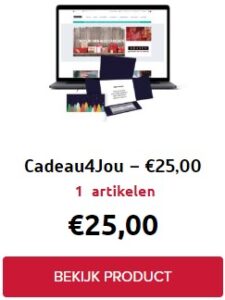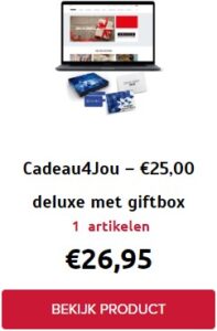Cadeau4Jou is erg toegankelijk omdat je zelf het bedrag kunt kiezen wat je werknemers kunnen spenderen. In onze Kranen webshop hebben we speciaal voor jou enkele opties op een rij gezet. Als voorbeeld hebben we hier verschillende bedragen gekozen tussen de €25,00 en €100,00. Je hebt hier de keus uit een geefmoment met een giftbox of via een e-voucher die ze ontvangen op het mailadres. Verder is er ook een ‘deluxe’ variant waar je naast het reguliere assortiment ook de keuze hebt uit extra populaire cadeaukaarten zoals: Zalando, Wehkamp, Coolblue, Gall & Gall, Bijenkorf, C&A, Hunkemoller, Adidas, H&M, ICI Paris en Rituals. Ben je geïnteresseerd in de mogelijkheid om direct Cadeau4Jou aan te schaffen?