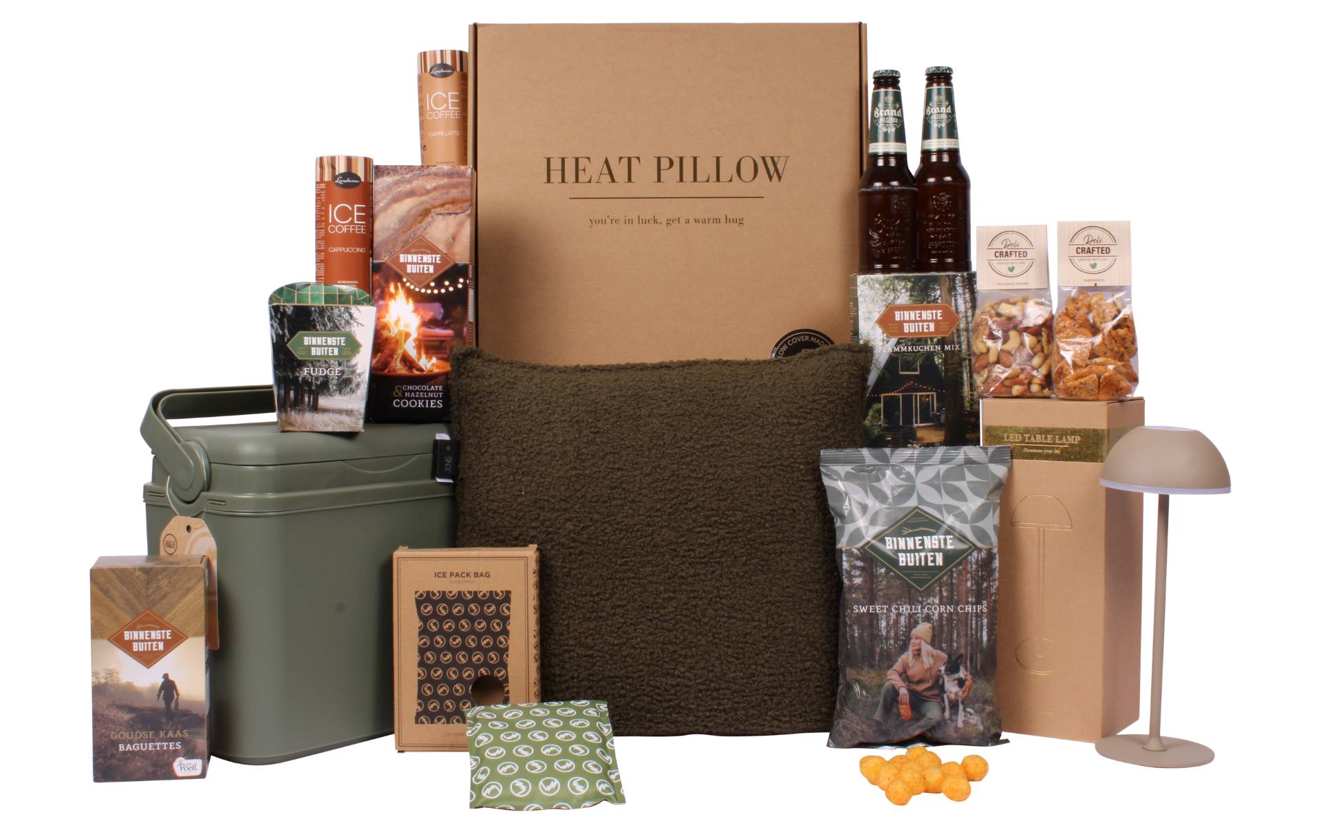 De natuur in trekken of liever lekker thuis blijven: met het kerstpakket Binnen & Buiten zit je gegarandeerd goed. De groen/kraft stijl en het stoere ontwerp van de foodverpakkingen sluiten perfect aan bij het thema. Voor thuis is er een heerlijk zacht warmtekussen met powerbank, en een stijlvolle LED tafellamp die je zowel binnen als buiten kunt gebruiken. Eropuit? Dan neem je de handige koelbox en koelzak gewoon mee. Aangevuld met smakelijke snacks, ijskoffie en koude Brand biertjes is dit pakket perfect voor binnen en buiten.