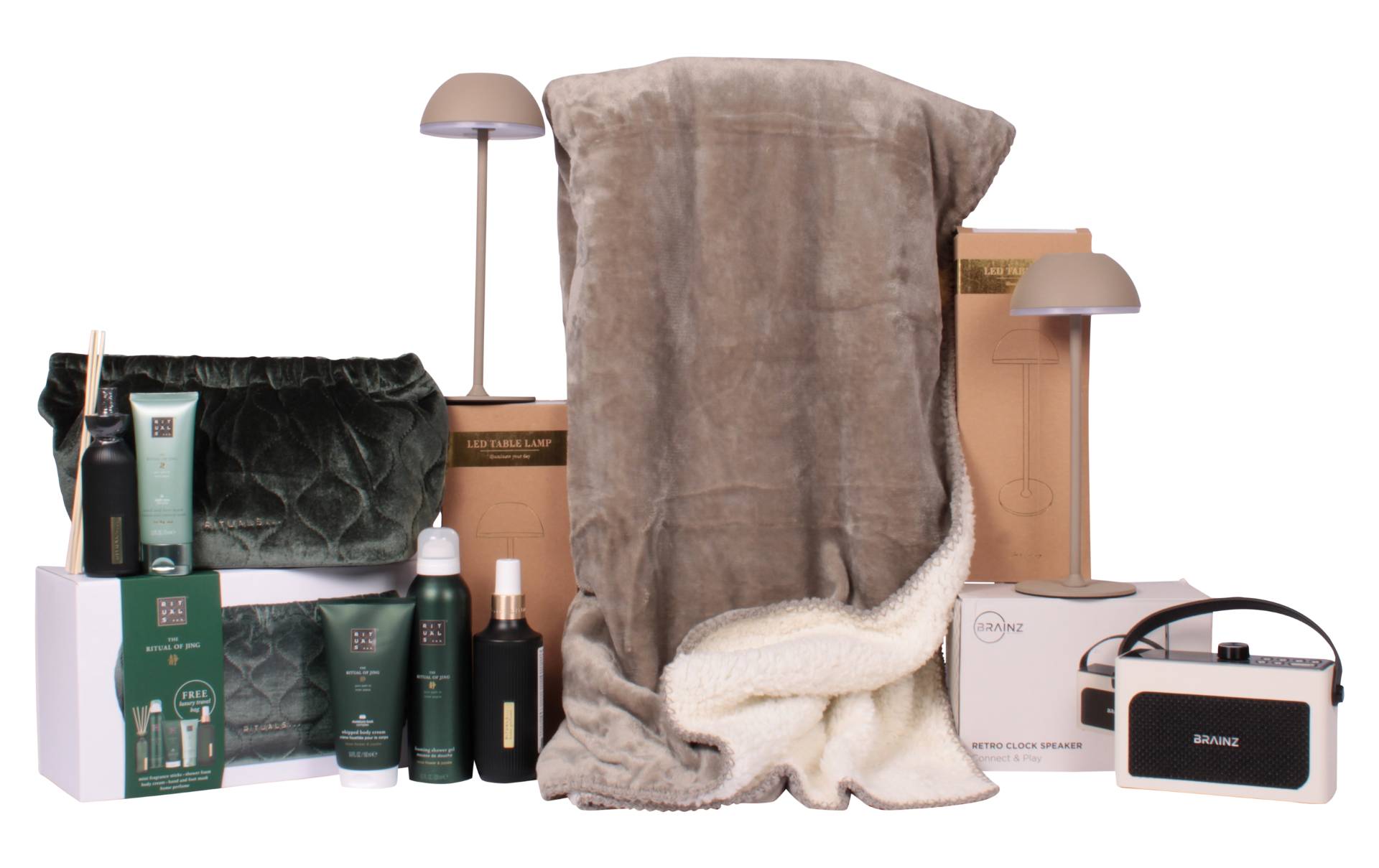 Met dit luxe geschenkpakket geef je een cadeau dat pure verwennerij uitstraalt. Laat je medewerkers genieten van de vernieuwde Rituals Jing large giftset, compleet met stijlvolle pouch. Voor ultieme ontspanning en rust in geur en verzorging. De twee moderne LED tafellampen zorgen voor een warme, sfeervolle gloed in huis, terwijl het zachte plaid uitnodigt tot heerlijk wegkruipen op de bank. Voor een vleugje nostalgie én moderne technologie bevat dit pakket ook een stoere retro speaker van Brainz, waarmee je in stijl kunt genieten van je favoriete muziek. Een elegant en doordacht kerstgeschenk dat luxe, comfort en ontspanning perfect combineert!