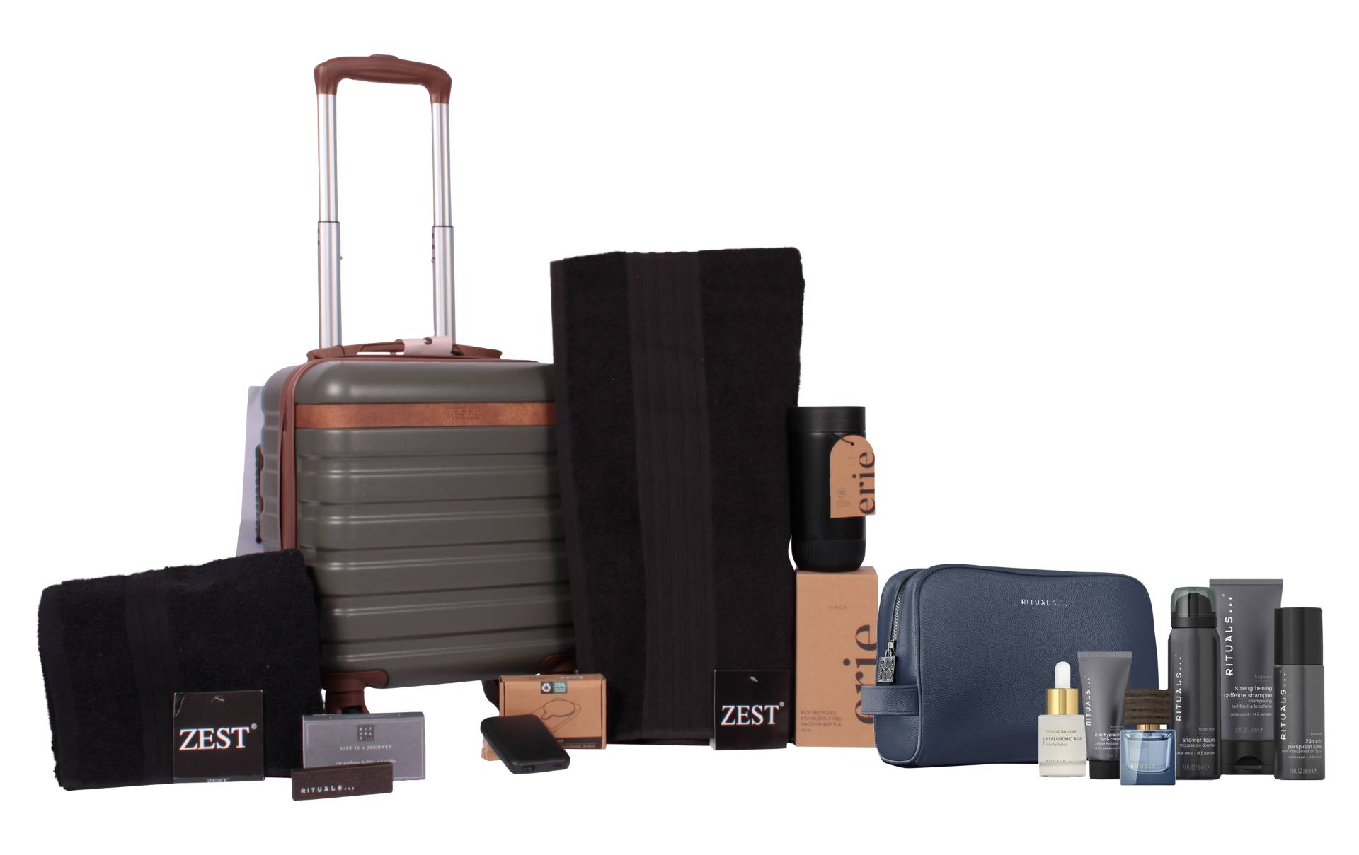 Het Gentleman’s Gear pakket is hét ultieme geschenk voor de moderne man. Dit luxe en praktische kerstpakket combineert stijlvolle verzorging met functionele accessoires die elke man goed kan gebruiken. De Rituals Homme large giftset, inclusief luxe toilettas, zorgt voor een moment van verzorging en ontspanning, terwijl de Rituals car refresher onderweg voor een heerlijke geur zorgt. Met de stevige trolley reis je in stijl, en de Zest handdoek en badlaken voegen een vleugje comfort toe aan elk moment van de dag. De magnetische powerbank houdt je apparaten opgeladen, en met de stijlvolle mok geniet je waar dan ook van je favoriete drankje. Hier wordt toch elke man blij van?!