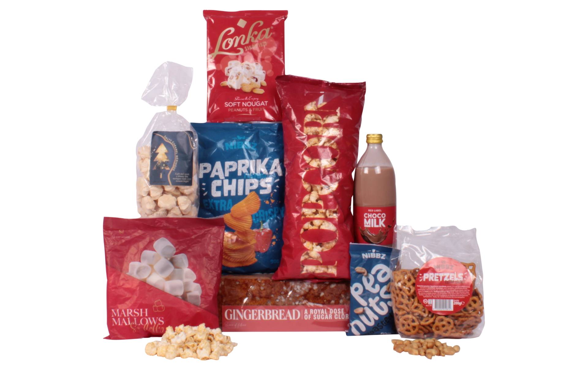 Een kerstpakket waarmee je een feest schenkt van smaken in een prachtige rood-blauwe samenstelling. Dit heerlijke kerstpakket biedt de perfecte balans tussen zoet en zout: van knapperige chips, pretzels en pinda’s tot zachte marshmallows, luchtige popcorn en romige nougat. Schenk daarbij een glas volle chocolademelk in en het genietmoment is compleet.