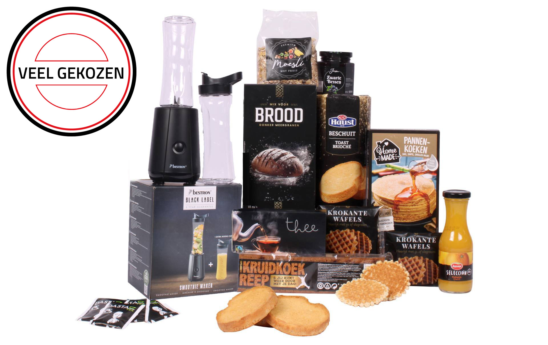 Een goed begin is het halve werk. Met dit kerstpakket geef je jouw collega’s een heerlijk (kerst)ontbijt en een vliegende start. De stijlvolle zwarte Bestron smoothie maker is het stralende middelpunt van dit pakket en maakt het makkelijk om elke dag gezond te beginnen. Geniet daarnaast van een verfrissend Juver sapje, een voedzame muesli, en handige bakmixen voor donker meergranenbrood en pannenkoeken. Direct aan tafel? Dat kan met de beschuit, krokante wafels, ontbijtkoekreep en een warme kop thee. Dat wordt lekker opstaan!