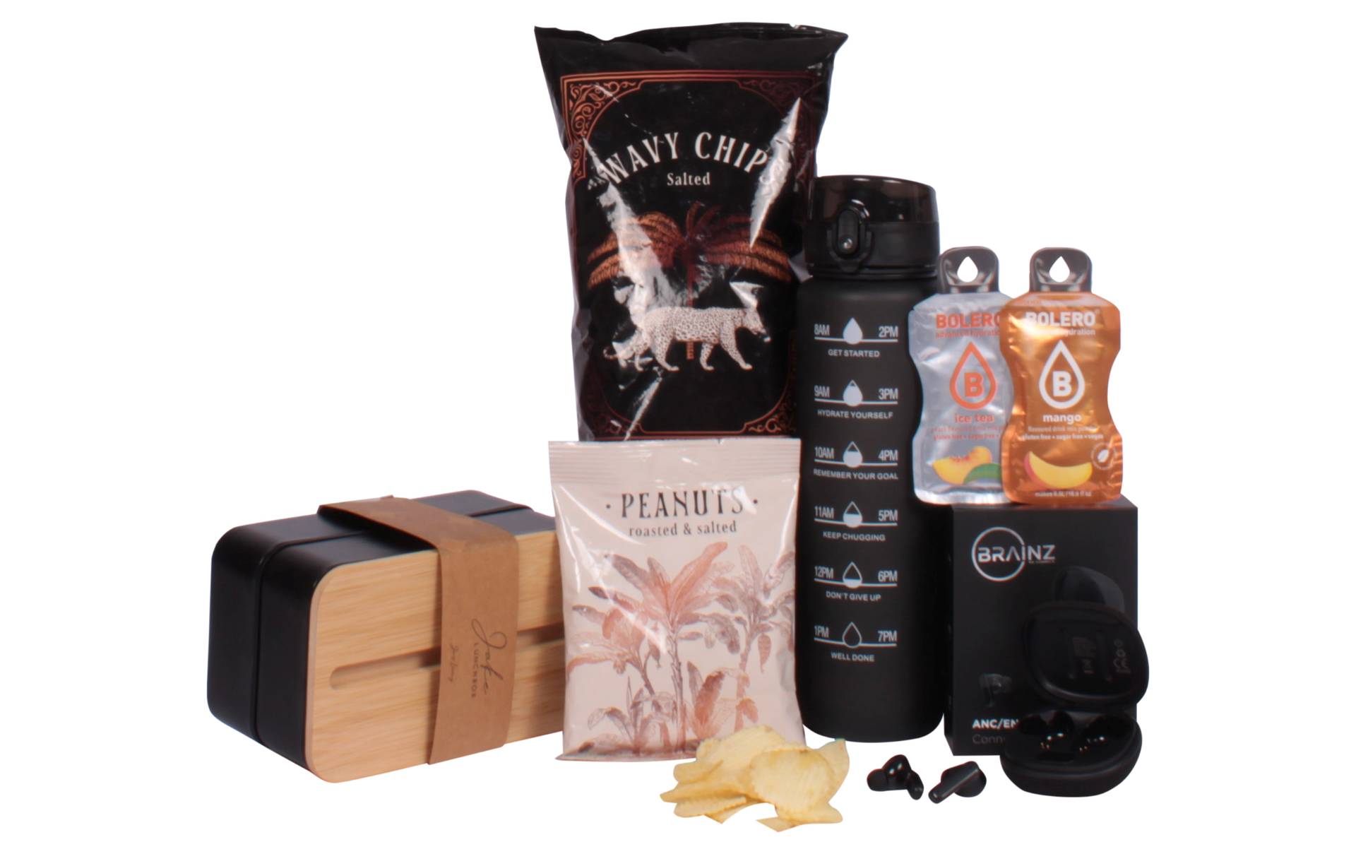Altijd onderweg? Dan is het On the go pakket perfect voor jou en je collega’s! Deze stijlvolle set bevat alles voor een actieve dag vol energie. Blijf gehydrateerd met de motivatiefles, voeg een vleugje smaak toe met de Bolero sticks en geniet onderweg van je lunch in de bamboe lunchbox. Met de Brainz earbuds luister je draadloos naar je favoriete muziek of podcast, waar je ook bent. En natuurlijk is er ook aan wat lekkers gedacht voor tussendoor. Het perfecte cadeau voor iedereen die houdt van gemak, stijl en een actief leven!