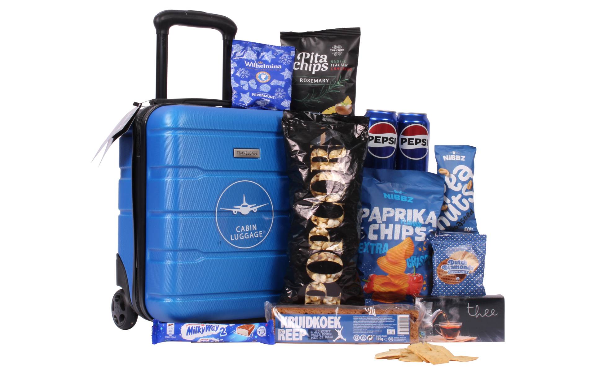 Dit is een kerstpakket die je niet snel vergeet! Met ‘Onder je stoel’ geef je een écht praktisch en opvallend cadeau: een 14-inch hardcase trolley die past onder een vliegtuigstoel. We verpakken de complete inhoud van het pakket in de trolley zelf. Dit zorgt voor een bijzondere en gave uitreiking. Met een smaakvolle selectie van blauw/zwarte fooditems heb je genoeg lekkers voor tijdens je volgende reis!