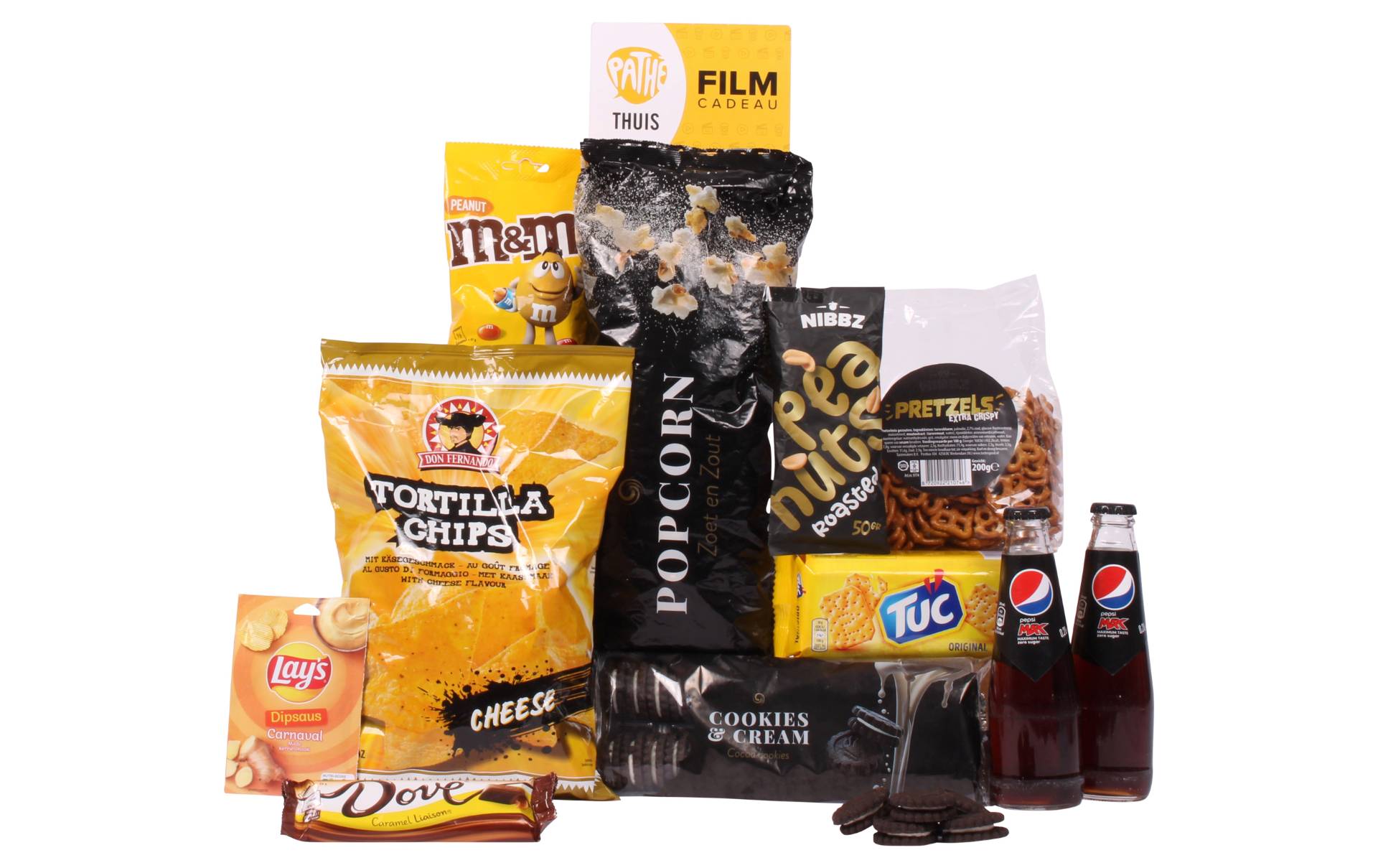 Een avondje uit, gewoon op de bank! Met dit kerstpakket geef je het ultieme relaxcadeau: een Pathé Thuis filmvoucher voor één film naar keuze, gecombineerd met een heerlijke mix van snacks, chips, chocolade, popcorn en pretzels. Twee koude Pepsi’s erbij en het filmavondje kan meteen beginnen. Zet je scherm aan, leun achterover op de bank en geniet van je eigen première thuis!