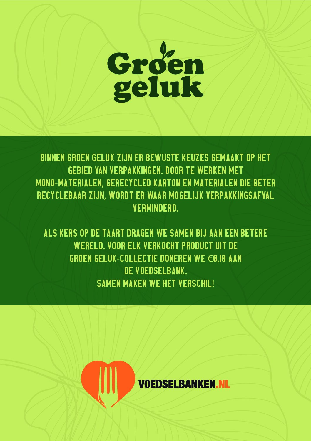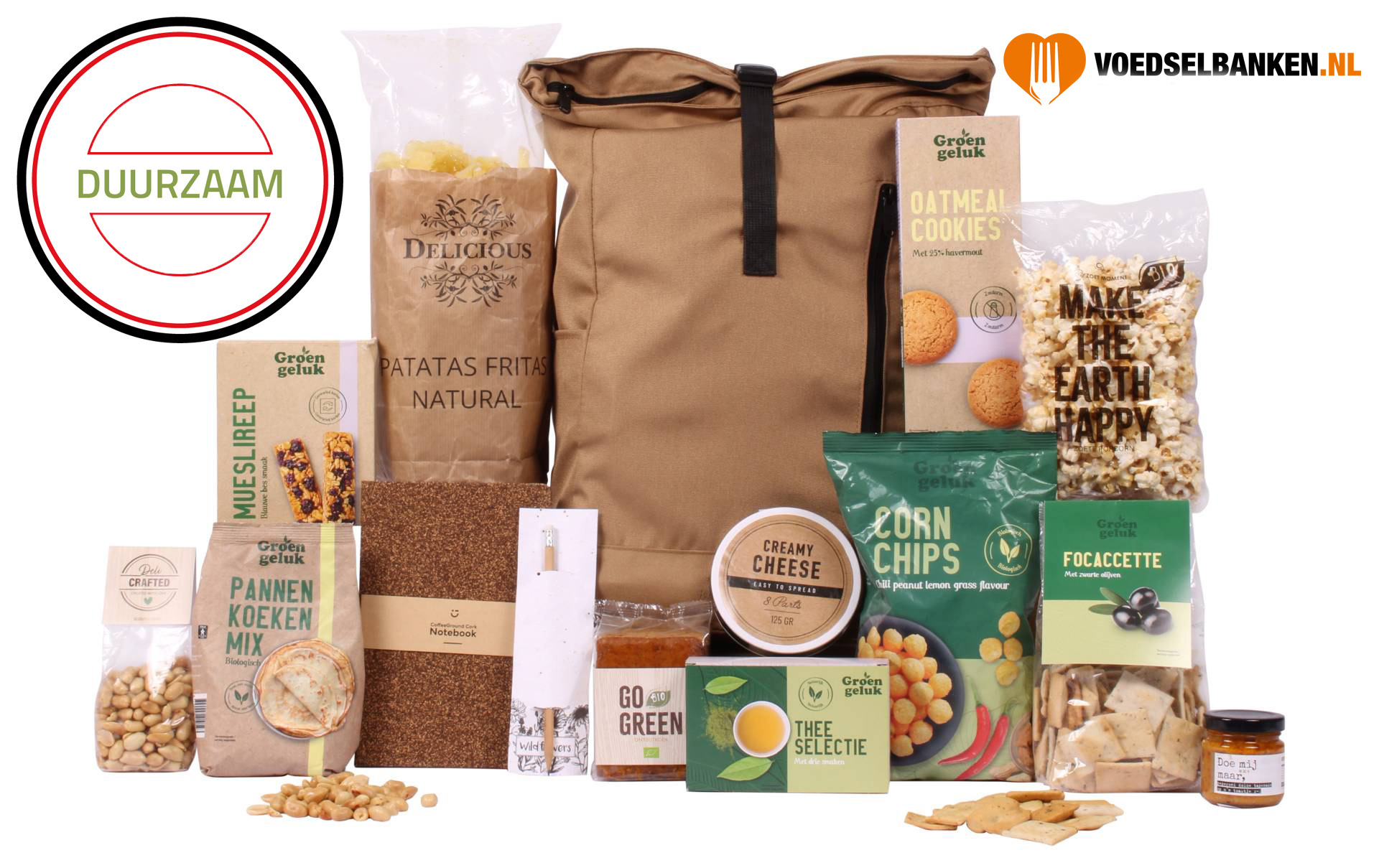 Op zoek naar een duurzaam kerstpakket? Zoek niet verder! Dit kerstpakket is niet alleen lekker, maar ook doordacht en duurzaam. De producten uit de Groen Geluk-collectie zijn verpakt in recyclebare of gerecyclede materialen, en voor elk verkocht item wordt €0,10 gedoneerd aan De Voedselbank. Zo geef je écht iets terug. De blijvende geschenken bestaat uit onder andere een stijlvolle basic rolltop rugzak van Recycle Bags, gemaakt van RPET en uitgevoerd in een natuurlijke zandkleur. Ook vind je een uniek notitieboek van koffiedik en een potlood met zaadpapier van wilde bloemen, perfect voor wie bewust wil leven én schrijven. Aangevuld met een smaakvolle selectie duurzame fooditems zoals biologische pannenkoekenmix, thee, snacks en smeersels is dit pakket een feestje om te geven én te ontvangen.
