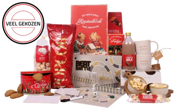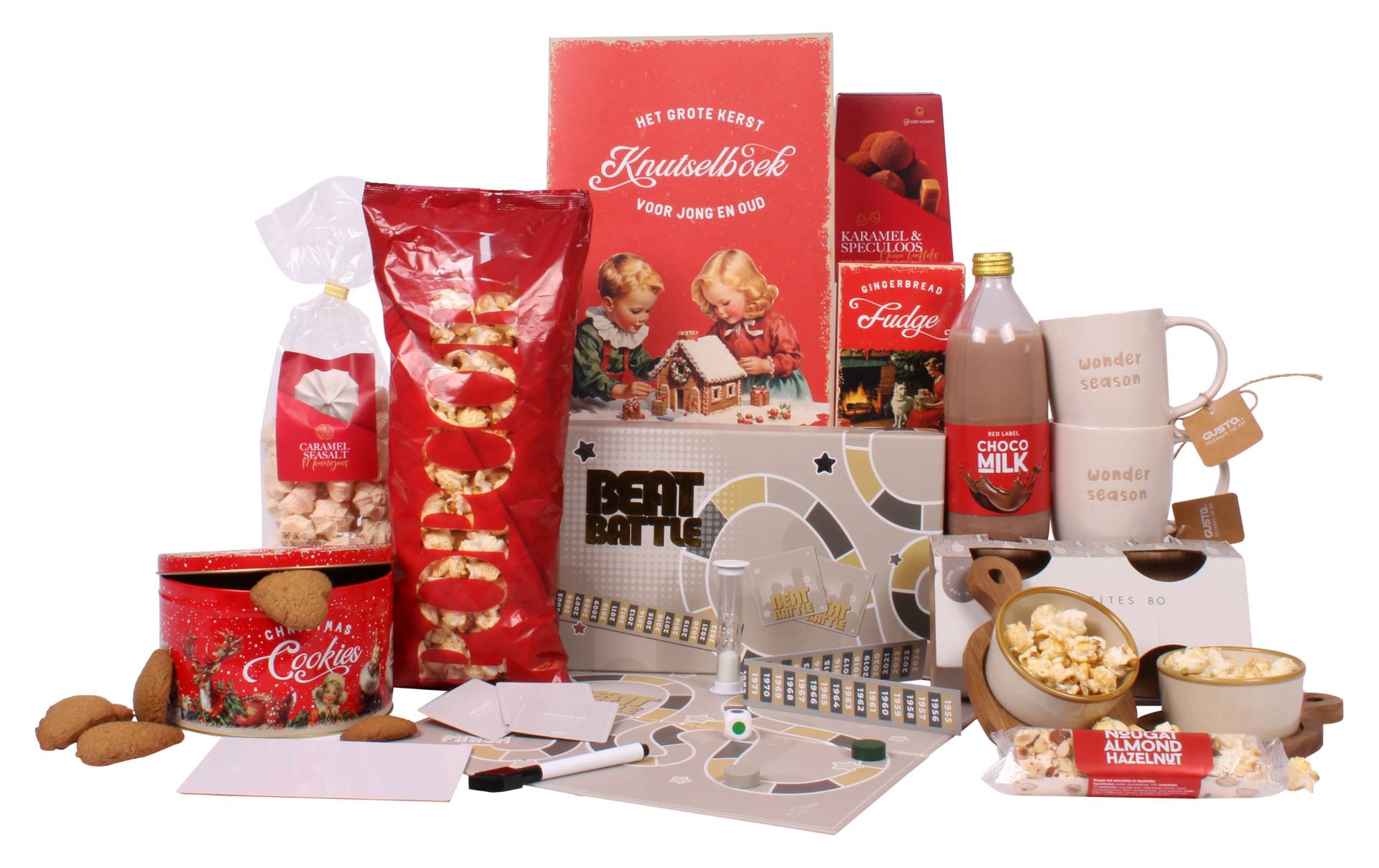 Schenk je collega’s een boel warmte, gezelligheid en ouderwetse kerstvreugde met dit kerstpakket! Met verpakkingen in de traditionele rode kerstkleur en geschenken die perfect zijn voor de gezellige avonden. Laat het spelplezier losbarsten met het Beat Battle bordspel, gebaseerd op Hitster. Verder vind je in dit kerstpakket Het Grote Knutselboek, een set van twee schaaltjes met houten plankje, twee sfeervolle mokken, aangevuld met zoete lekkernijen. Kortom een kerstpakket vol nostalgie, ontspanning en gezelligheid!