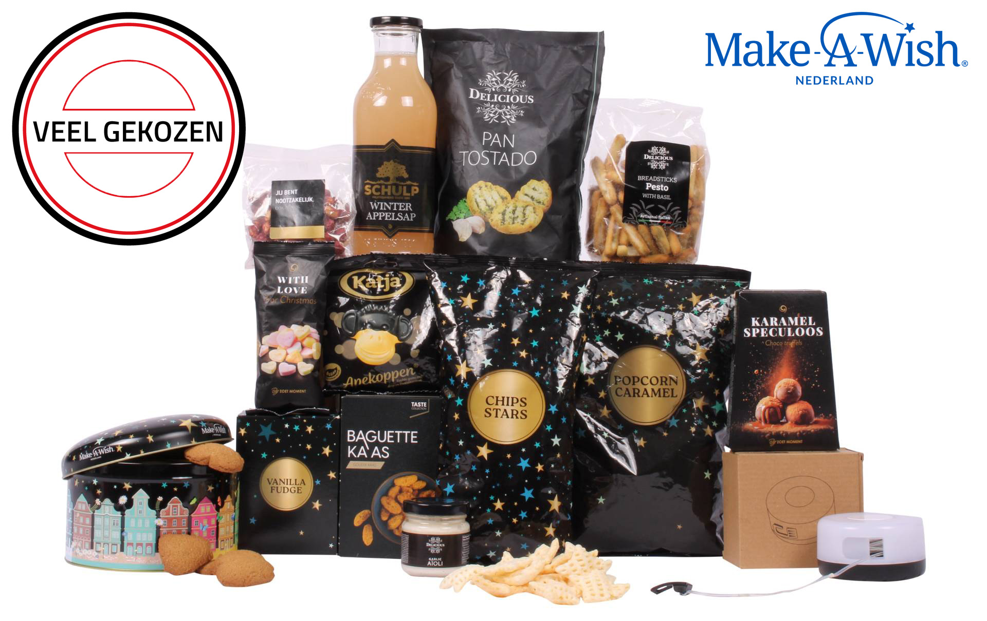 Een wens, lichtjes én een goed doel. Wish Upon A Star is meer dan alleen een kerstpakket. De fraaie sterrenverpakking geeft dit pakket een magische uitstraling, perfect passend bij de winterse feestdagen. Daarnaast zijn deze artikelen gekoppeld aan Stichting Make-A-Wish Nederland, een prachtig gebaar in de kerstgedachte. De sfeervolle oplaadbare kampeerlamp met 8 meter lichtsnoer zorgt voor warm licht, zowel binnen als buiten te gebruiken. Aangevuld met een rijk aanbod aan lekkers is dit een pakket om samen van te genieten.